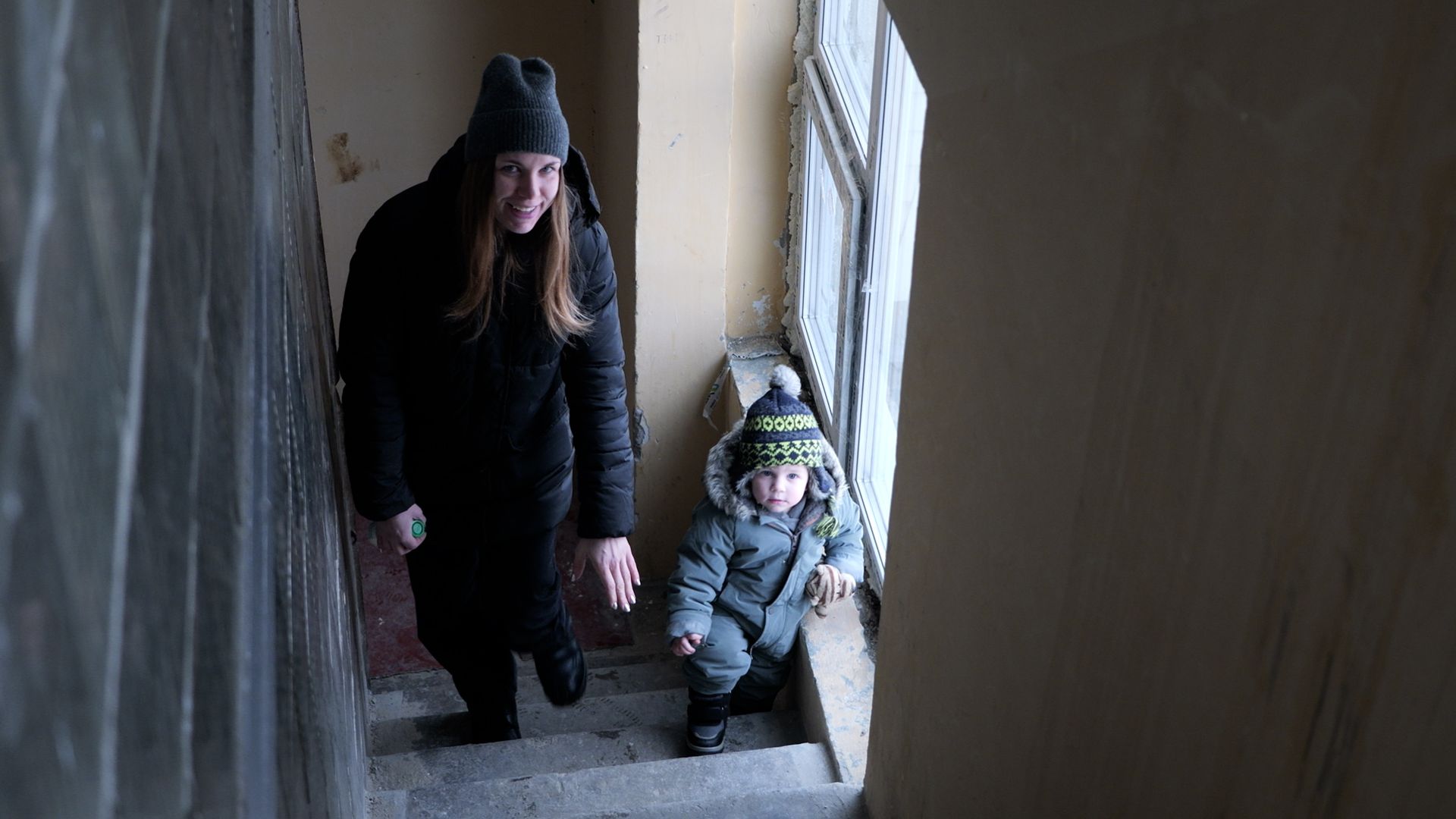 The sound of deep, slow breaths echoes up a frozen staircase, followed by footsteps.